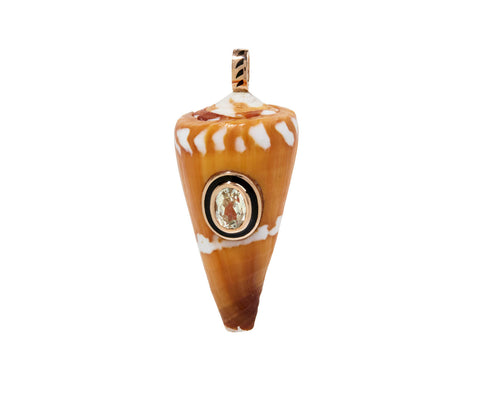 Stunning in its bold, sea inspired design, this Dezso pendant is like a beach treasure you found during a walk in the surf. The coffee cream colored shell is set with an oval white sillimanite framed in 18K rose gold and black enamel. It connects to the bale of rose gold painted with tiny black enamel shark fins.