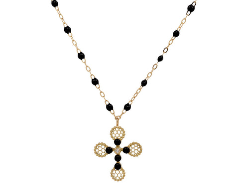 Wear this sparkling Gigi Clozeau pendant that allows you to subtly put your spirituality out there for the world to see. The black pearled gold cross is accented with intricate 18K gold lace at all 4 points and a tiny diamond in the center. It hangs from the center of the black resin and 18K yellow gold chain. Wear it alone or layered with your other favorites!