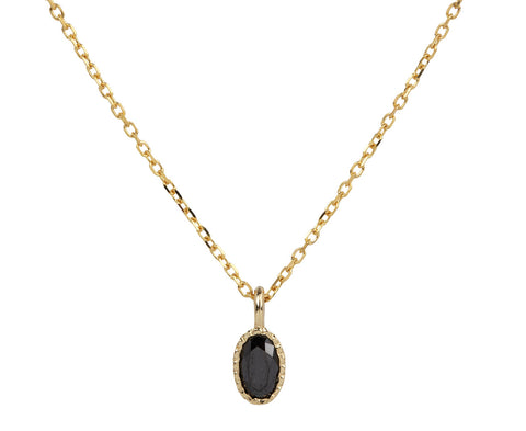 With its quiet, modern elegance, this Jennie Kwon necklace is a contemporary take on the traditional diamond pendant necklace. The oval black diamond is set in a scalloped 14K yellow gold bezel and sits at the base of the 14K yellow gold chain. Wear it alone or layered with your other favorites.