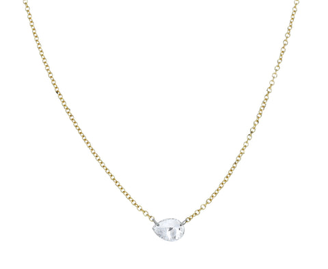 With its barely-there presence and hint of sparkle, this stunning Todd Pownell necklace is a modern interpretation of the traditional diamond pendant. Hanging horizontally from the center of 18K yellow gold chain is a pear shaped diamond (.51ct). It connects to the chain with tiny platinum rings. Perfect alone or layered with your other favorites.