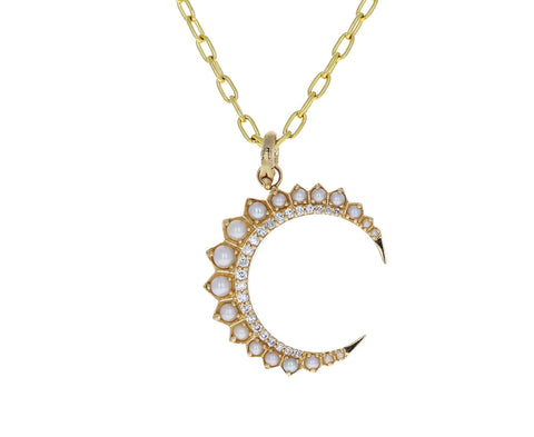 This stunning, shimmering Storrow crescent charm is a jaw dropping example of modern meets vintage design. The crescent is made up of 14K yellow gold and is set with pearls and diamonds for the perfect combination of sparkle and iridescence color. It hangs from the 14K yellow gold clasp, positioned to be a versatile addition to any chain bracelet or necklace.