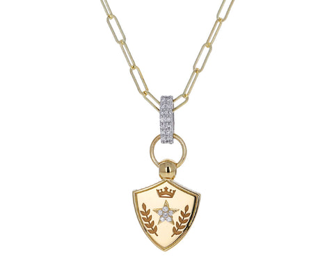 Bold, sophisticated, and statement making, this stunning Foundrae necklace exudes a modern elegance. The 18K yellow gold mini crest is set with a three dimensional diamond star cradled by a stamped laurel leaf sitting underneath a crown. It hangs from the 18K white gold and diamond slide at the center of the super fine clip chain, creating your perfect everyday talisman.