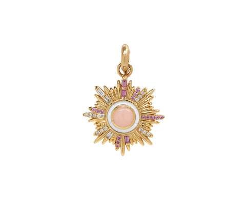 Stunning in detail and subtle color, this Storrow charm pendant has been inspired by Victorian era design. The 14K yellow gold medallion is engraved with radiating lines broken up by round white diamonds and pale pink sapphires. A smooth pink opal sits at the center of the white enamel halo at the center of the medallion. It hangs from a 14K yellow gold bale which opens.