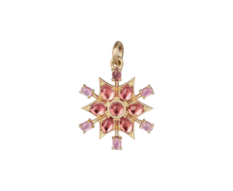 Add this vintage inspired pink tourmaline starburst charm created by Storrow to any of your favorite chains for a touch of colorful decadent whimsy. The 14K yellow gold dimensional charm is made up of prong set tourmalines. It hangs from the 14K yellow gold clasp, positioned to be a versatile addition to any chain bracelet or necklace.
