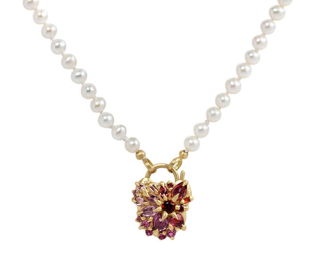 Stunning in its combination of classic materials and edgy design, this Polly Wales pearl necklace is unlike anything else in your collection. Using her captivating, unorthodox technique of casting stones directly into gold, the matte 18K yellow gold padlock pendant is covered in a surface of inverted red and pink sapphires. It's set at the center of the perfectly round small seed pearls and holds the 18K yellow gold clasp.