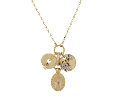 With its warm tones of rich yellow gold and intense sparkle, this Foundrae necklace will become your everyday talisman. The trio of 18K yellow gold medallions hang from the center of the adjustable 18K yellow gold chain. One 18K yellow gold diamond push gate link holds the 18K yellow gold reverie mini crescent charm, allowing it to be removed in order to create another version of the stunning necklace. The other two 18K yellow gold and diamond mini coins are soldered directly on to the chain. This necklace is perfect alone or layered with your other favorites.