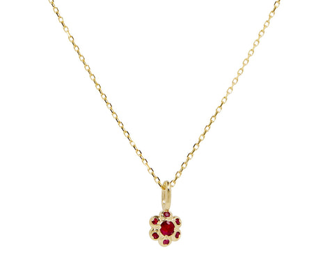With its sweet, delicate style, this  Jennie Kwon necklace is all about its easy-to-wear design. The tiny 14K yellow gold flower has ruby petals surrounding the ruby center. The flower hangs along the 14K yellow gold chain to create the perfect addition to your layered necklace collection.