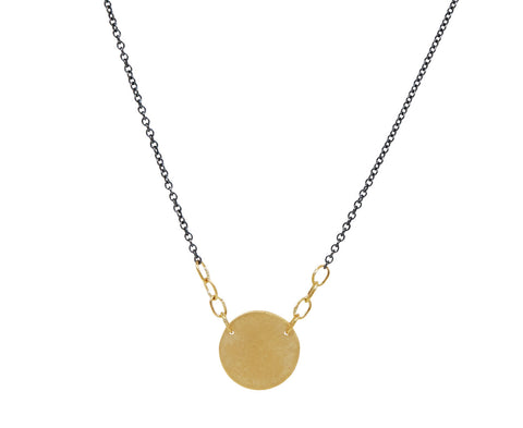With its contrast of materials and eye-catching style, this Sarah McGuire necklace has a cool, commanding presence. The 18K yellow gold satin finish disc hangs from an oxidized sterling silver chain. Alone, it makes a statement but we love it layered with your other Sarah McGuire favorites. .