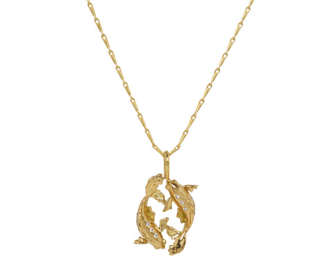 Wear this Brent Neale zodiac necklace as your new personal talisman. The 18K yellow gold Pisces fish pendant is accented by round, white diamonds and hangs from the 18K yellow gold chain. Sagittarius is anyone born between February 19th and March 20th.