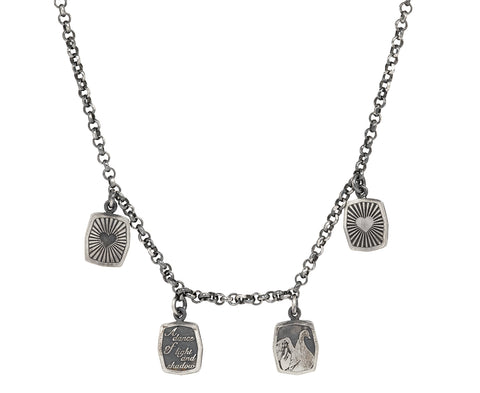 Playful, modern and edgy, this Tó Garal necklace will add a bold vibe to any casual collection. Spaced along the blackened sterling silver chain are two heart shields, a swan shield and a shield with the words 'A dance of light and shadow'. Alone or paired with other statement-making necklaces, let this one define your entire look.