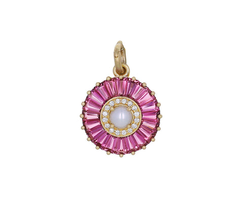 Stunning in detail and color, this Storrow charm pendant has been inspired by Victorian era design. The 14K yellow gold charm is set with tapered baguettes of pink tourmaline set in tiny 14K yellow gold prongs surrounding a round white pearl. Sparkling white diamonds surround the pearl adding a touch of shimmer. The pendant hangs from a 14K yellow gold bale which opens, allowing it to be a versatile addition to any chain bracelet or necklace.