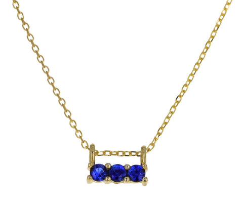 With its cool toned color and delicate style, this stunning Jennie Kwon necklace is all about its quiet restraint. The three round, blue sapphires are held by tiny 14K yellow gold prongs. The stones hang at the base of the 14K yellow gold chain to create the perfect addition to your layered necklace collection.