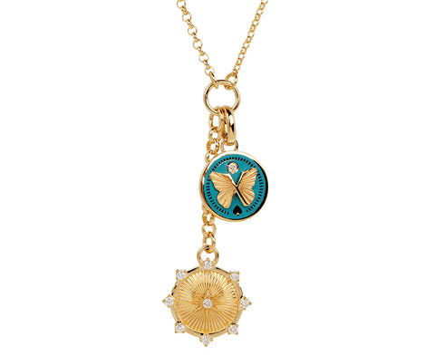Solid and substantial, this Foundrae necklace will become your everyday talisman. Hanging from the 18K yellow gold medium belcher extension at the base of the 18K yellow gold mixed fine and small belcher chain is a round, 18K yellow gold and diamond medallion. An aqua ceramic butterfly pendant connects to the belcher chain with a removable 18K yellow gold push gate annex link. With its bold, emblematic presence, it's a perfect necklace to wear every single day.