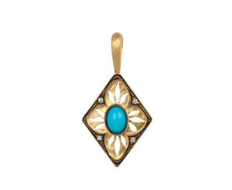 Offering bold color and a hint of sparkle, this Cathy Waterman pendant is a perfect addition to any chain or strand of beads. The smooth, oval turquoise is framed by an open window design of 22K yellow gold with blackened edges set with diamonds. Here, we have it hanging from Cathy's signature Spanish chain.