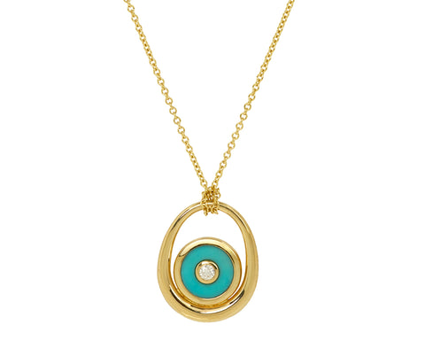 Inspired by antique pocket watches and the idea of intuition as our own inner compass, this Retrouvai necklace ups the ante on her signature compass pendant. The 14K yellow gold and turquoise pendant has a round, bezel set diamond at its center. It hangs from the center of the long, 14K yellow gold chain. Perfect whether worn alone or layered with your other favorites.