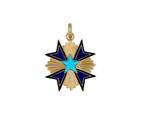 Stunning in detail and dimension, this extraordinary Storrow pendant exudes a vintage talismanic vibe. The 14K yellow gold charm is set with a turquoise star at its center with lapis and black enamel rays. It hangs from the 14K yellow gold clasp, positioned to be a versatile addition to any chain bracelet or necklace.