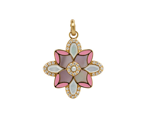 With its sweet design and feminine color palette, this Storrow pendant exudes a vintage vibe. The 14K yellow gold floral inspired charm is set mother-of-pearl petals surrounded by shimmering white diamonds. Pink enamel and a pearl center accent the composition, which hangs from the 14K yellow gold safety clasp bale.