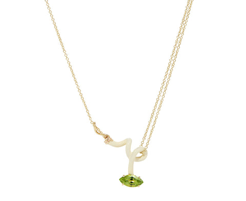 Add this Bea Bongiasca necklace to any playful, casual look. Hanging from the 9K yellow gold chain - from a double strand on one side and a single on the other - is a looping vine of sterling silver coated in shiny panna enamel. Marquise peridot are set in 9K yellow gold at the center point of the pendant.