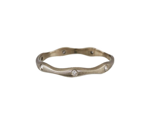 Earthy and elegant, this Rebecca Overman diamond band is perfect alone or nestled against another one of her rings. The wavy design is wrought in 14K white gold and set with sparkling clear diamonds in the thicker portions of the band.