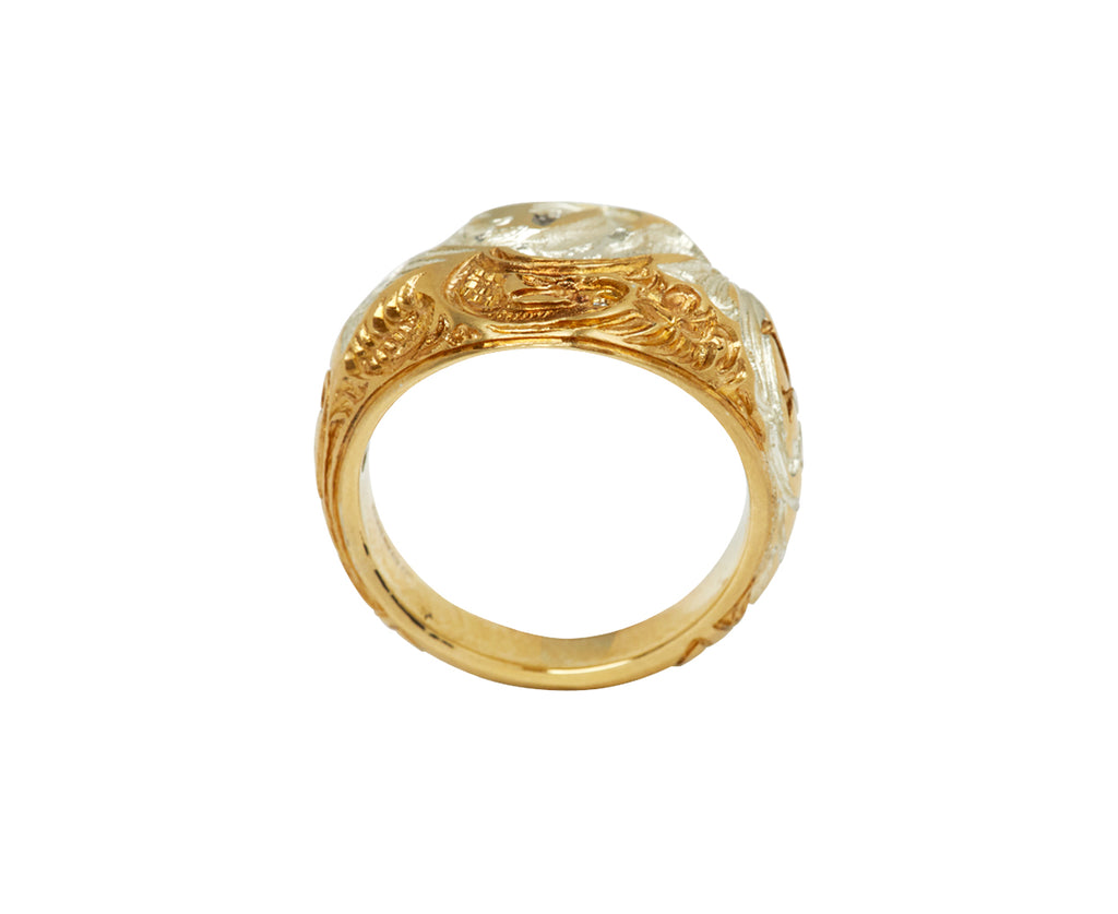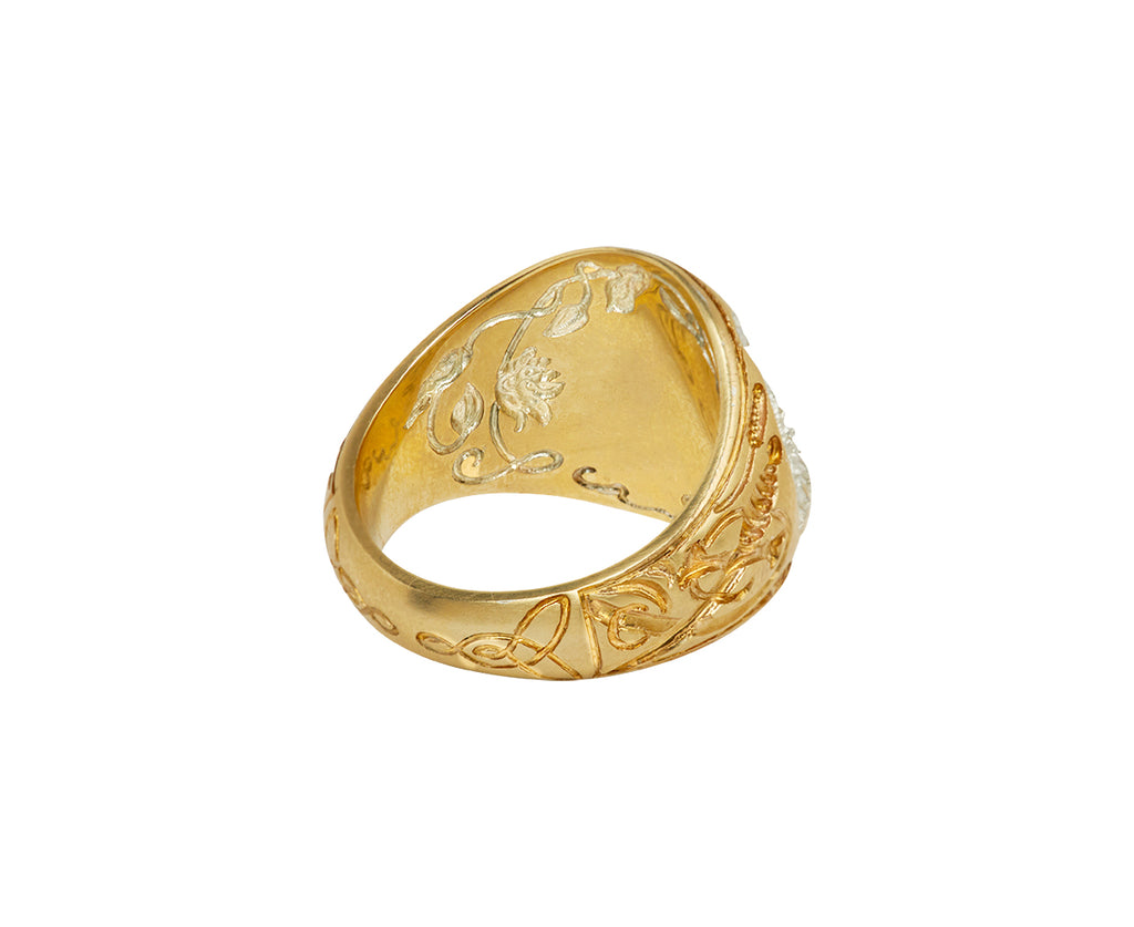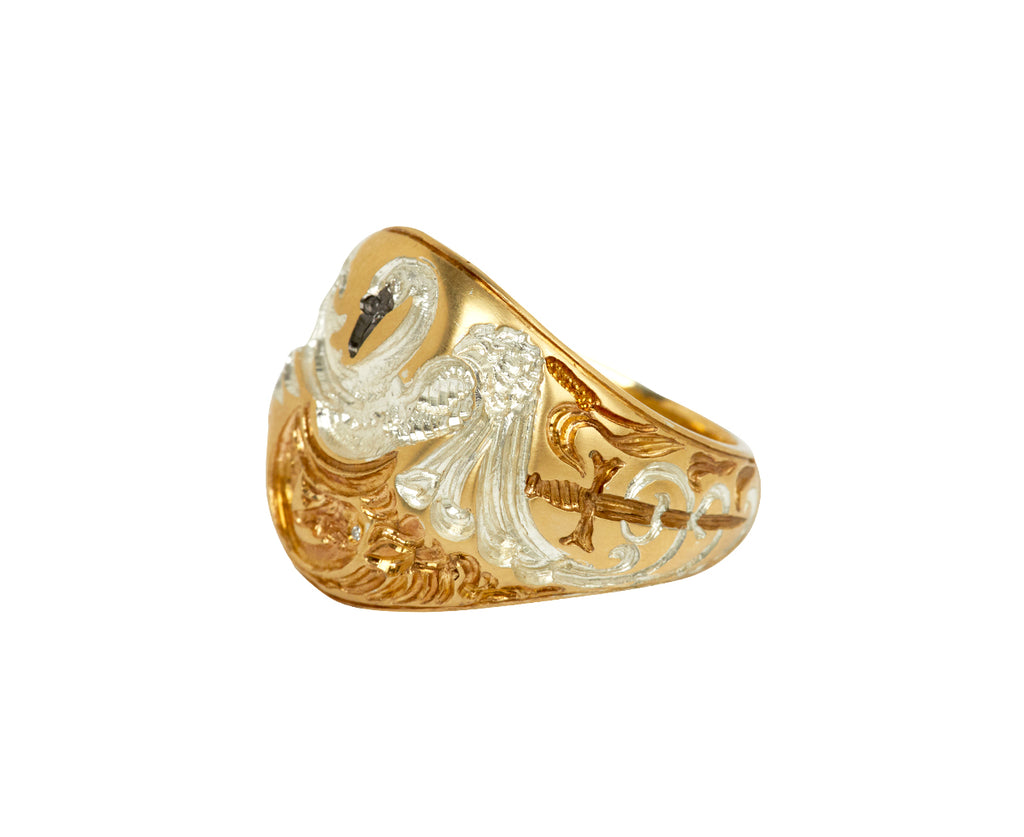 This hand engraved 9K yellow gold Castro Smith signet ring has an statement-making, nature inspired design. The large, round ring face has been engraved with a swan, spread wings and all. The swan looks at their reflection, and is covered in chrome rhodium. Diamond eyes and two swords accent the ring.