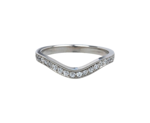 With its minimal, understated design this Single Stone ring is perfect nestled against a diamond solitaire. The polished platinum band is set with old European cut diamonds along the front and curves at the center, creating a band meant to be worn with one of their stunning solitaires.