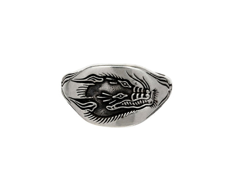 Wear this Digby & Iona signet ring as a playful way to show your artistic side, Digby and Iona designed this ring in collaboration with tattooer Damien J. Thorn. The sterling silver ring is cast with a dragon dog face.