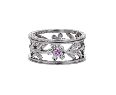 Platinum Diamond Sapphire Flower Vine Milgrain Band