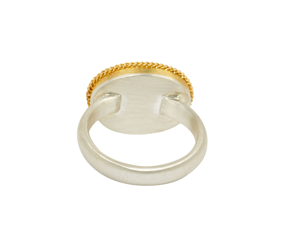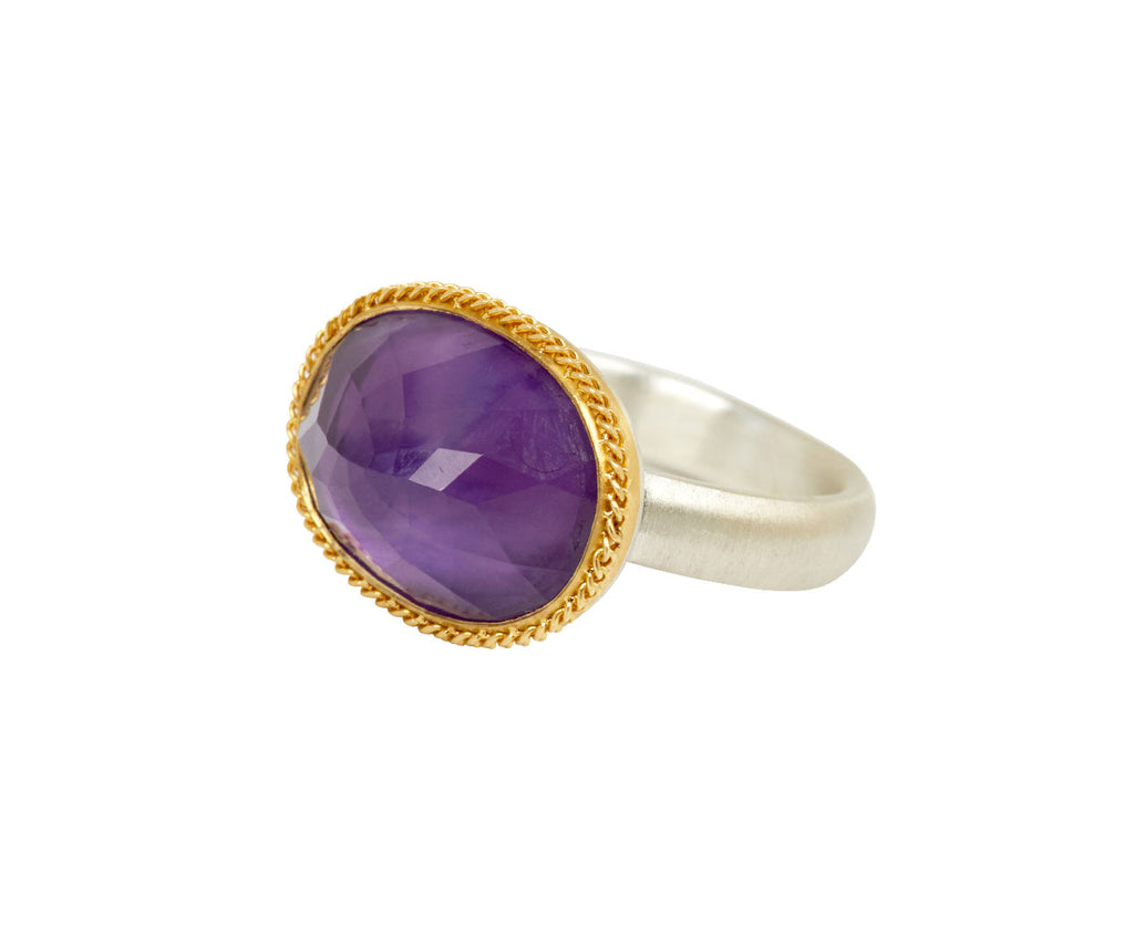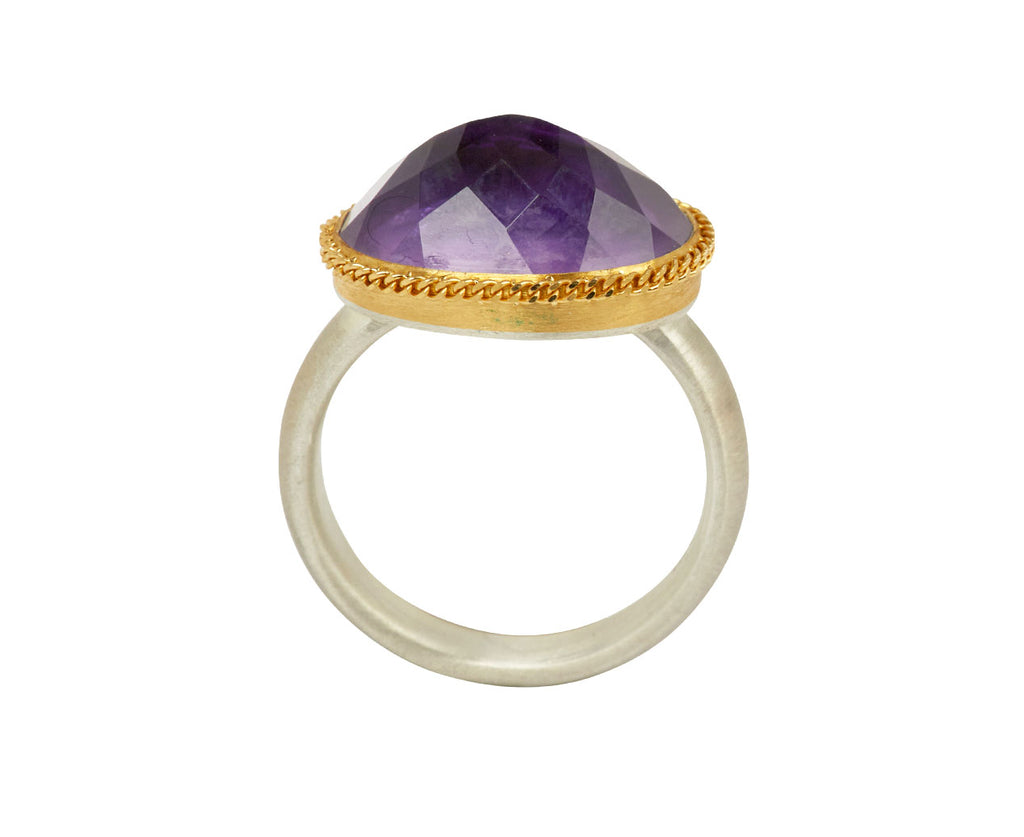 With a gorgeous, regal toned color story, this Amali ring has a stunning, restrained luxury. The horizontally set amethyst reveals a dramatic, inverted faceted surface which rises to an apex. It is set in a meticulously hand wrought braided frame of 18K yellow gold with detailed granulation and centered on the brushed sterling silver band. Wear this as a modern alternative to the traditional engagement ring or cocktail ring.