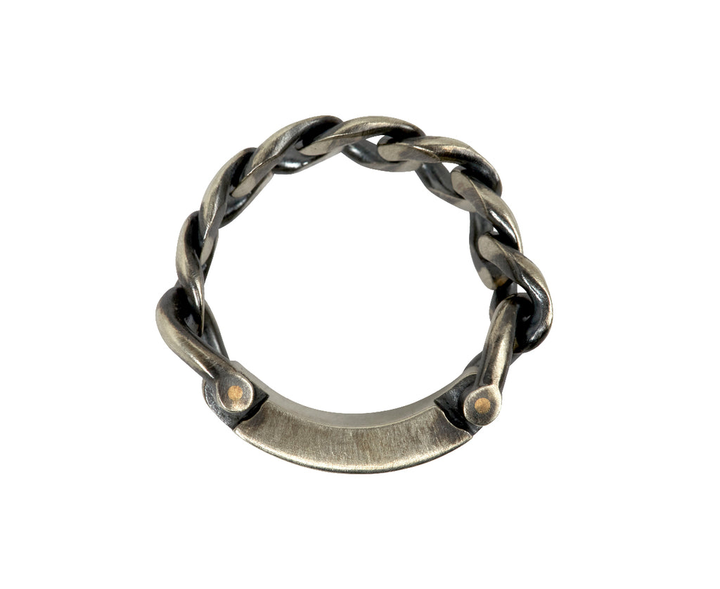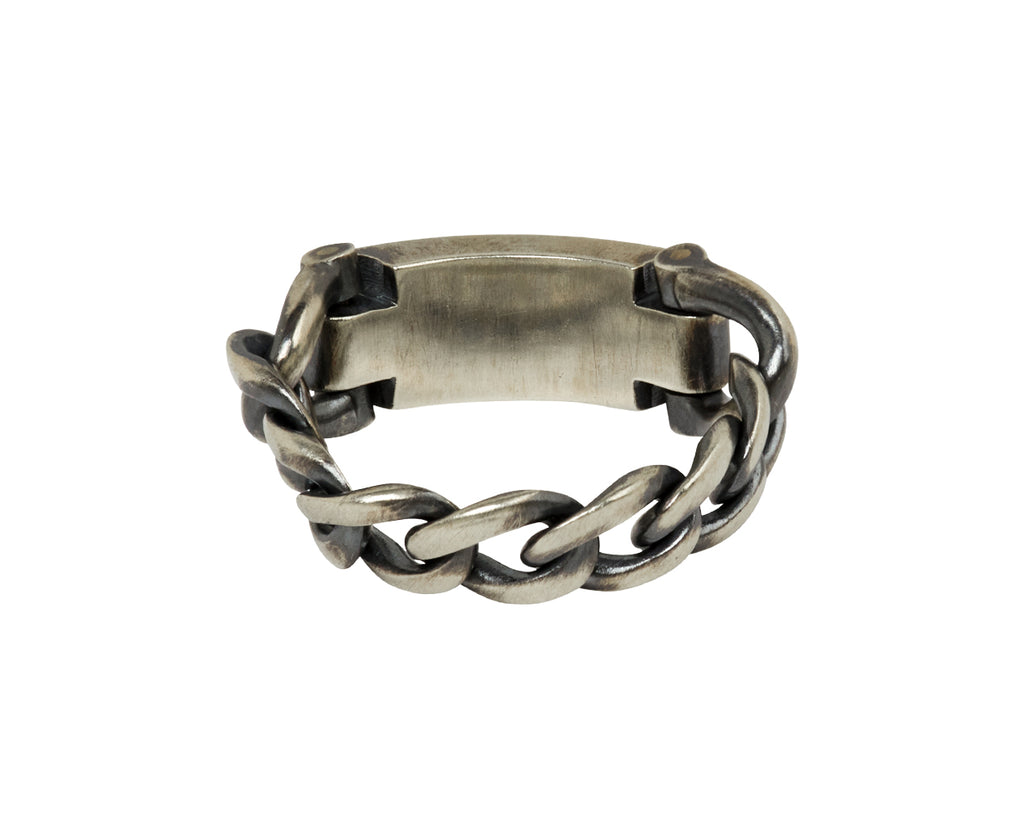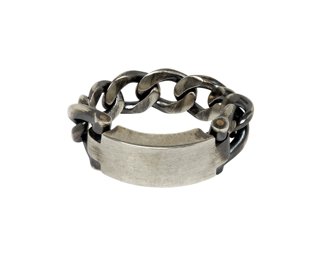 Stunning in its modern, edgy design, this hum ring exudes an edgy elegance and statement-making detail. Set at the center of the sterling silver chain links is a matte sterling silver ID bar. Slip this on for a hint of easy-to-wear style.