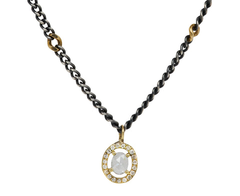 Absolutely breathtaking in its quiet, meticulous, and intricate detail, this Rusty Thought necklace exudes an other worldly presence. The rose cut diamond is covered in a surface of light reflecting facets. It is framed in a setting of 18K yellow gold surrounded by tiny white diamonds and hangs in the center of the oxidized sterling silver and 18K gold chain.
