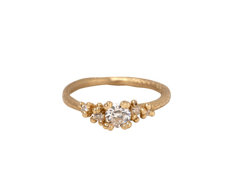 Absolutely breathtaking in its balance of traditional elements and earthy design, this Ruth Tomlinson ring is the perfect way to symbolize an engagement. Unconventional and sure to be passed down for generations, this antique diamond is set with Ruth's signature granules of 14K yellow gold gold, adding just the right amount of texture. This ring is finished with tiny side diamonds and a slightly textured 14K yellow gold band.