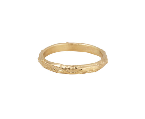 With a detailed textured surface, this Ruth Tomlinson ring has a romantic and old world design. Made of 14K yellow gold, the band has a decorative scroll symbolism along its surface. The perfect ring to symbolize a special occasion and stand the test of time.