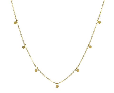 Shimmering with a surface of matte gold, this Sia Taylor necklace exudes a preciously feminine allure. The tiny gold dots are arranged along the base of the chain to create a quietly elegant necklace. Wear this on its own for a delicate flush of warmth, or layer it with your other favorites for a personalized, eclectic look.