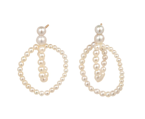 With their striking sophistication, these Sophie Bille Brahe earrings are a stunning alternative to the traditional pair of pearls. Two intersecting loops of white freshwater pearls hang from the 14K yellow gold and pearl post backs. With the perfect amount of texture and dimension, these earrings will up the ante on any outfit.