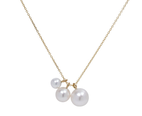 With its restrained elegance and subtle movement, this Sophie Bille Brahe necklace is a modern interpretation of the traditional pearl pendant. Hanging along the 14K yellow gold chain are three white, freshwater pearls tapering in size and each moving independently along the chain. Wear this alone or layered with your other favorites.