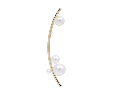 With a flourish of whimsical elegance and modern simplicity, this single Sophie Bille Brahe earring has a fluid, sculptural presence. Meant for the left lobe, the 14K yellow gold earring curves outward and is set with round, white freshwater pearls at its top and bottom. Statement-making no matter what earring you wear on the other side.