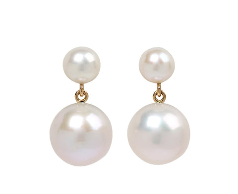 These bold Sophie Bille Brahe pearl earrings are a modern interpretation of the traditional design. The luminous white pearls are attached to 14K yellow gold posts. Hanging below are two larger round freshwater pearls. The versatility of this pair make them the the perfect crossover from casual to formal.