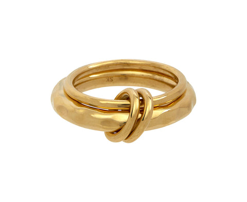 With its eye-catching design, this Spinelli Kilcollin ring has a versatile, statement making design. Two bands of polished 18K yellow gold - one wider with a hammered surface and one thinner - connect with two 18K yellow gold rings. Wear them all on one finger or spread them out along two. This would also make an excellent alternative to the traditional wedding ring for someone with unconventional style.