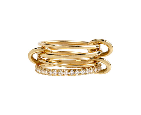 Spinelli Kilcollin has upped the ante with this stunning, statement-making ring. Four 18K yellow gold are held together by their signature 18K yellow gold connectors. One of the 18K yellow gold bands is encrusted with a row of sparkling white diamonds. Wear it as a thick, multi-ring stack or spread it across your fingers.