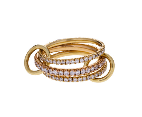 This striking, modern series of linked diamond pavé rings from Spinelli Kilcollin exudes a captivating, confident sense of style. The center band of 18K rose gold is encrusted with sparkling diamond micro-pavé and connects to the two 18K yellow gold diamond bands with two yellow gold loops. Wear them as a stack or spread them over two or three fingers. This would make an incredible alternative to the traditional wedding band!