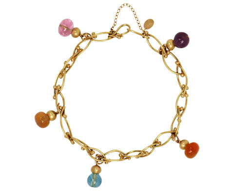 This stunning combination of vibrant stones and soft, 18K yellow gold links is a perfect, signature Mallary Marks bracelet. Hanging from the 18K yellow gold links at evenly spaced intervals are five buoy charms - two Ethiopian opal, one pink tourmaline, one aquamarine and one lavender chalcedony. This bracelet is a modern classic and certainly a future heirloom.