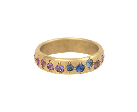 With a bold, statement-making design, this Annie Fensterstock ring is a confetti colored combination of vibrant, rainbow sapphires and rich 18K yellow gold. Each of the round stones is star set into the golden band to create a happily imperfect design. Wear this ring to celebrate a wedding, anniversary or another amazing occasion.