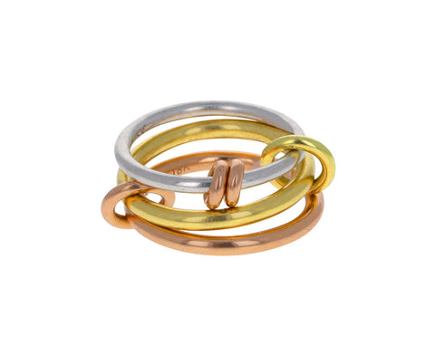 With its edgy, eye-catching and style-defining design, this Spinelli Kilcollin triple band Raneth ring gives you the stacking look all in one ring. The bands of 18K yellow gold, 18K rose gold and sterling silver connect with rings of 18K yellow gold. Two tiny rings of rose gold add just the right amount of contrast to the sterling silver band. Tactile and distinctive, you can wear this ring stacked or spread out along three fingers. This would also make an excellent alternative to the traditional wedding ring for someone with unconventional style.