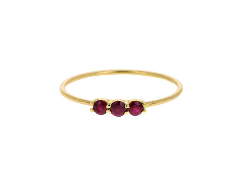 With just a whisper of sparkle and feminine sophistication, this Jennie Kwon ring is perfect for everyday. The thin, rounded band of 14K yellow gold is adorned with three, round rubies at its center. Perfect alone or stacked with your other favorites, this ring exudes a classic-meets-modern style.