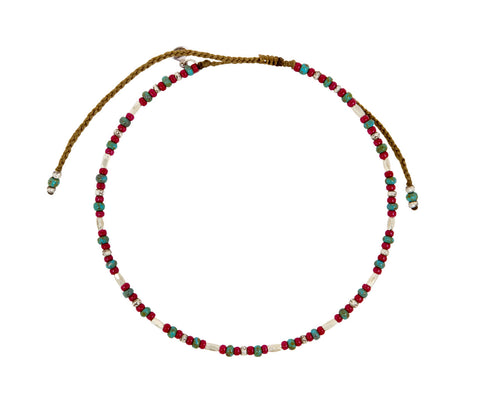 With this rich, unexpected color combination, wearing this Tai bracelet adds a bold, casual, bohemian vibe to your look. Green and red turquoise beads mingle with the sterling silver tube beads on brown nylon cord.