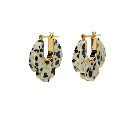 With their captivating color combination of black and burnt orange spotted jasper, these Talkative earrings have an edgy, modern, and minimal vibe. The polished crests of dalmatian jasper are lined with 18K gold and attach to latch posts. Pair them with everything from casual to formal.