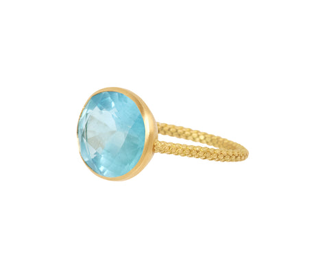 Striking in is bright, sky blue tone and minimal design, this Talkative ring has a statement-making presence. The faceted oval of shimmering aquamarine is horizontally set in an 18K yellow gold bezel and centered on the textured 18K yellow gold horseshoe band.