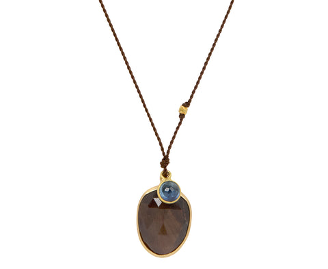 With a quiet, earthy elegance and easy-to-wear style, this Margaret Solow necklace is a stand out in any casual jewelry collection. The larger drop of sapphire is covered in a surface of light reflecting facets and framed by thin bands of 14K yellow gold. The smaller sapphire is smooth and framed with 18K yellow gold. The pendants are knotted at the base of a brown nylon cord. Wear this alone, or layer it with your other favorites for a modern, bohemian look.