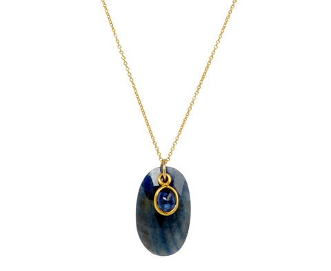 With its quiet sparkle and earthy elegance, this Margaret Solow necklace is a stunning, modern alternative to the traditional colored stone pendant. A faceted deep blue sapphire hangs as the backdrop for a smaller sapphire framed by a thin band of 18K yellow gold. Both hang from the center of a 14K yellow gold chain. Alone or layered with your other favorites, this necklace can be easily worn from carpool to cocktails.