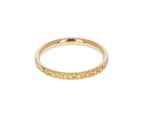 Taking its cue from the traditional diamond eternity band, Artëmer has created a stunning, modern alternative. Each of the sparkling round diamonds is set in the center of the hand engraved star across the full surface of the 18K yellow gold ring. Wear it as a wedding ring or as an addition to a stacking collection.